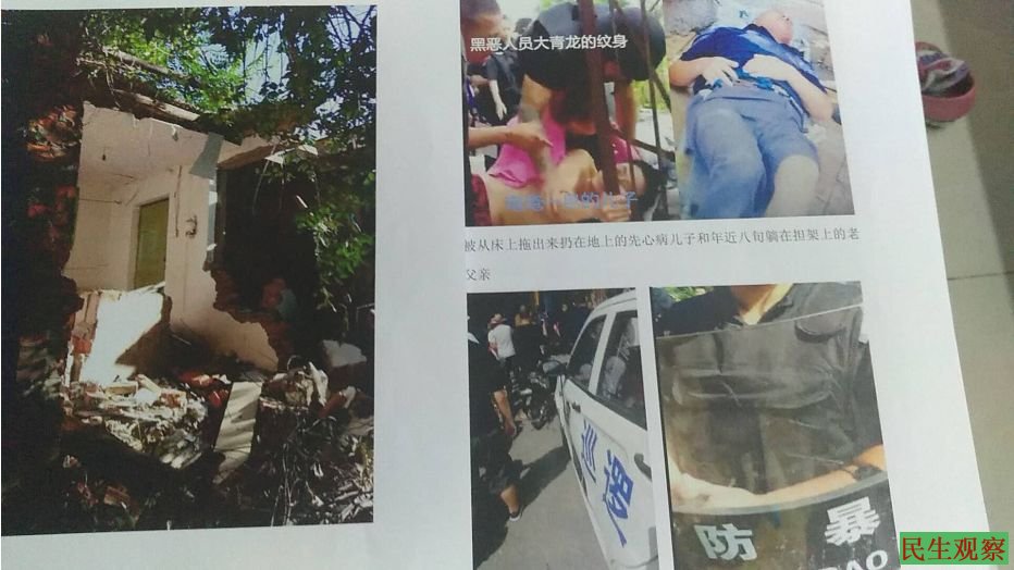 情急之下,马国良又拿出国务院[2003]42号文等相关文件给他们看,他们却看都不看,恶狠狠说到:“那算个球毛,现在老子说了算。”之后,他们便不由分说的开始疯狂打砸,并将马国良和年近八旬的老伴、小儿媳和患有心脏病的儿子马连波等人强行拖出门外,扔在泥泞的地上控制起来,之后他们就派来了大型挖掘机实施强拆,几分钟后,在挖掘机的轰鸣声中,马国良世世代代生活的家就变成了一堆废墟,所有家当和生活用品都被悉数掩埋在废墟之中。