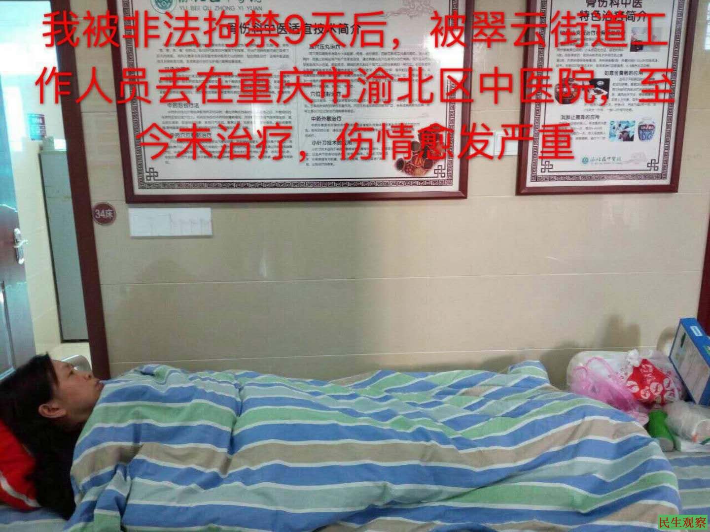 【民生观察2018年4月24日消息】本网获悉,重庆市北部新区(现两江新区)鸳鸯镇凉井村冤民晏祥菊,因进京上访维权遭到重庆当地维稳部门多次打击报复,致胸部、胸椎体骨折及身体多处受伤住院,目前重庆维稳部门出尔反尔没有信守承诺,现在她面临无人照顾无医生治疗等状况。