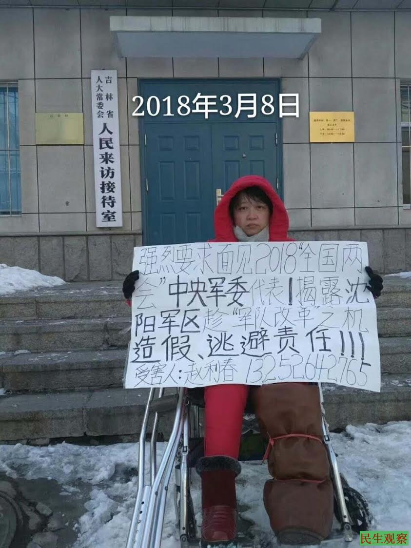 无奈之下,赵利春只好坐着轮椅逐级举报,但这又遭到长春维稳部门的打压,维稳人员多次非法拘禁她,严苛的拘禁又导致她患上多种疾病。