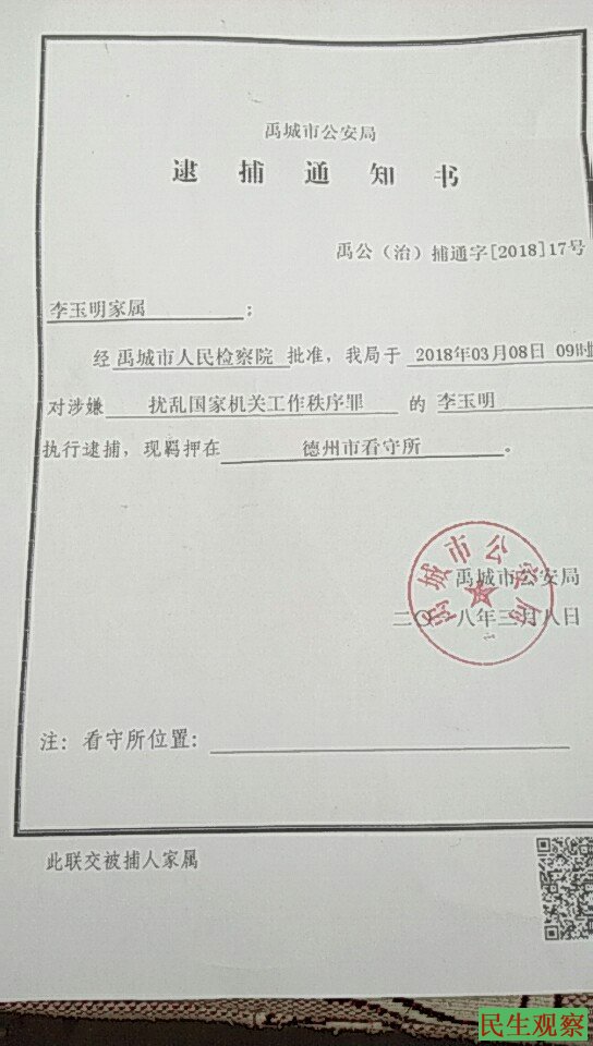 据李玉明女儿李桂芝对本网讲述,父亲李玉明因低保金被当地民政部门无故取消而上访多年,问题始终没有得到解决。2018年2月8日他再次前往北京国家信访局反映述求,期间老是有不明身份人员跟踪监视,数天以后他被山东驻京办人员截获,交给地方维稳人员强制带回,回来后被直接关进了德州市看守所,期间,家人多次前往禹城市公安局打听其情况无果。2月14日家人终于收到禹城市公安局下达的《拘留通知书》,才得知父亲被以“扰乱国家机关工作秩序和敲诈勒索罪”刑拘,现关押在德州市看守所。3月9日家人又收到禹城市公安局送达的《逮捕通知书》,获知父亲已被禹城市检察院批准逮捕,到今天为止已经被超期羁押长达98天了。