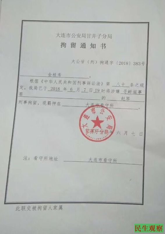 【民生观察2018年6月10日消息】本网获悉,辽宁大连维权人士赵琴,于6月7日被大连市公安局甘井子分局以涉嫌“寻衅滋事罪”刑拘,现羁押在大连市看守所。而广东深圳维权人士林群勇亦于同样罪名被拘。
