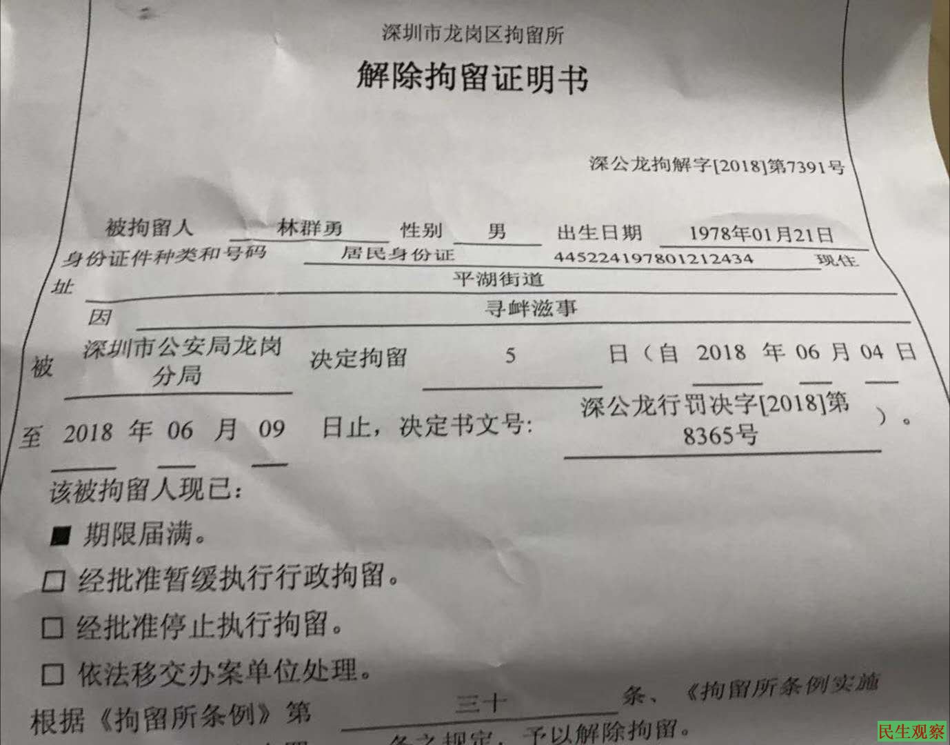 另外,广东深圳维权人士林群勇,于六四当天被深圳市公安局龙岗分局以涉嫌“寻衅滋事罪”行政拘留5天,昨天(6月9日)拘留期满得以释放。据知情人士透露,林群勇是因为六四当天在网上发表敏感言论被拘的。