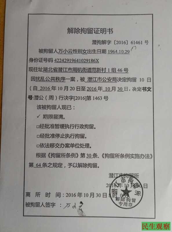 知情人士:“万小云在维权过程中在2016年1月5日,2016年4月13日,2016年5月18日,2016年10月19日,2016年11月22日,以上是分别拘留10天,7天不等,2016年12月8日行政拘留10天后转为刑事拘留,在刑事拘留期满后以涉嫌寻衅滋事罪逮铺。由于万小云身体原因两个月后取保候审释放回家,在万小云取保候审一年即将到期时,湖北潜江公安局再次将万小云案件送检察院起诉,万小云一个计划生育手术失败的受害者却遭到如此的打击报复,精神是受到双重打击伤害,万小云说;在检察院没有给任何手续,检察院要她签字,她拒绝签字所以检察院没有给她出具任何手续,万小云说;她目前是村里一个不相干的一个人担保再次给予了取保候审,潜江公安局检察院,法院等相关机构就是如此违法打击报复参加选举的万小云的”。