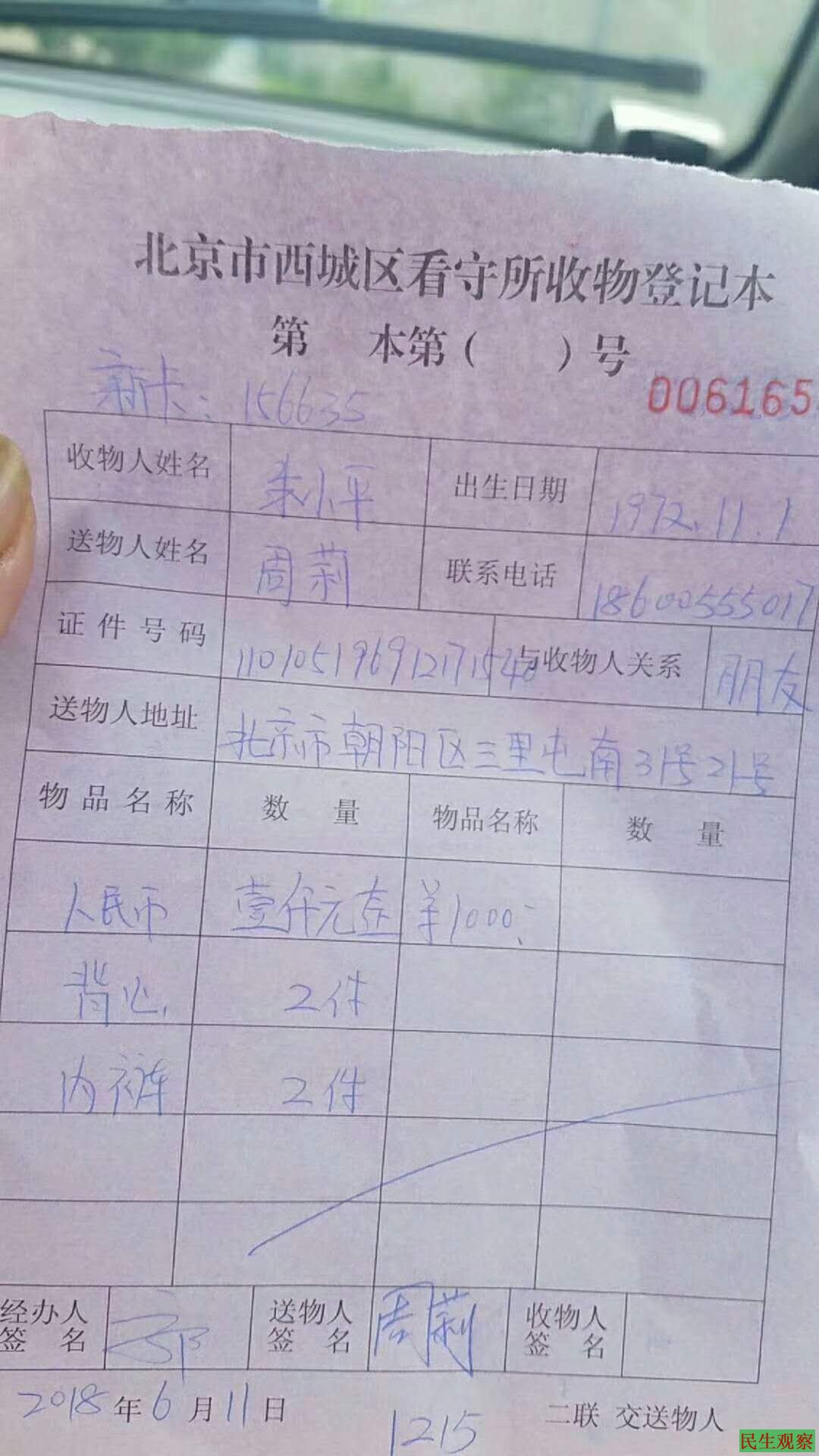 另外,因在今年六四当天,前往北京天安门游玩,后被抓进派出所关押审讯的安徽芜湖朱小平以及湖北襄阳的何斌、徐彩虹夫妇已经证实被刑拘,目前三人均被关押在北京西城看守所。据悉,今年是六四29周年纪念日,当天朱小平和何斌、徐彩虹夫妇一起前往天安门游玩,随后被北京警察抓到天安门分局关押审讯,第二天(6月5日),三人均被北京公安局西城分局以涉嫌“寻衅滋事罪”刑拘,现关押在北京西城看守所。前天,北京维权人士周莉经多方打听得知三人均被关押在此,于是为朱小平存了衣物和钱,而何斌、徐彩虹夫妇的手续她还未收到,等收到后她再来存。