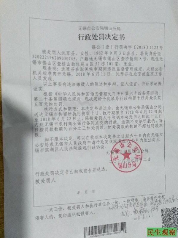 其《行政处罚决定书》上显示:沈琴芬在取保候审期间违反监督管理规定,未经公安机关批准离开无锡,2018年6月11日,沈琴芬在北京被驻京工作人员发现,现决定给予沈琴芬行政拘留10天并处罚款500元的处罚。