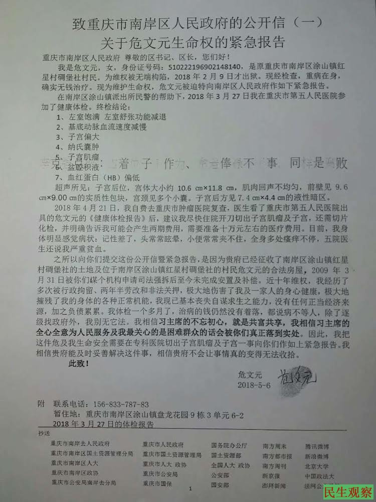 据危文元对本网讲述,她因房屋被强拆未获得安置补偿而上访维权,期间,多次遭重庆涂山镇维稳部门打压迫害。2015年8月10日被重庆警方以涉嫌“寻衅滋事罪”刑拘,同年9月17日,又被重庆渝中区警方以同样罪名逮捕。在被关押二年半后,于今年2月9日出狱。2018年3月在南岸区涂山镇派出所的帮助下进行了体检,经检查其身患多种重病但她却无钱医治。经过努力,南岸区涂山镇政府承诺对她提供医疗救助。
