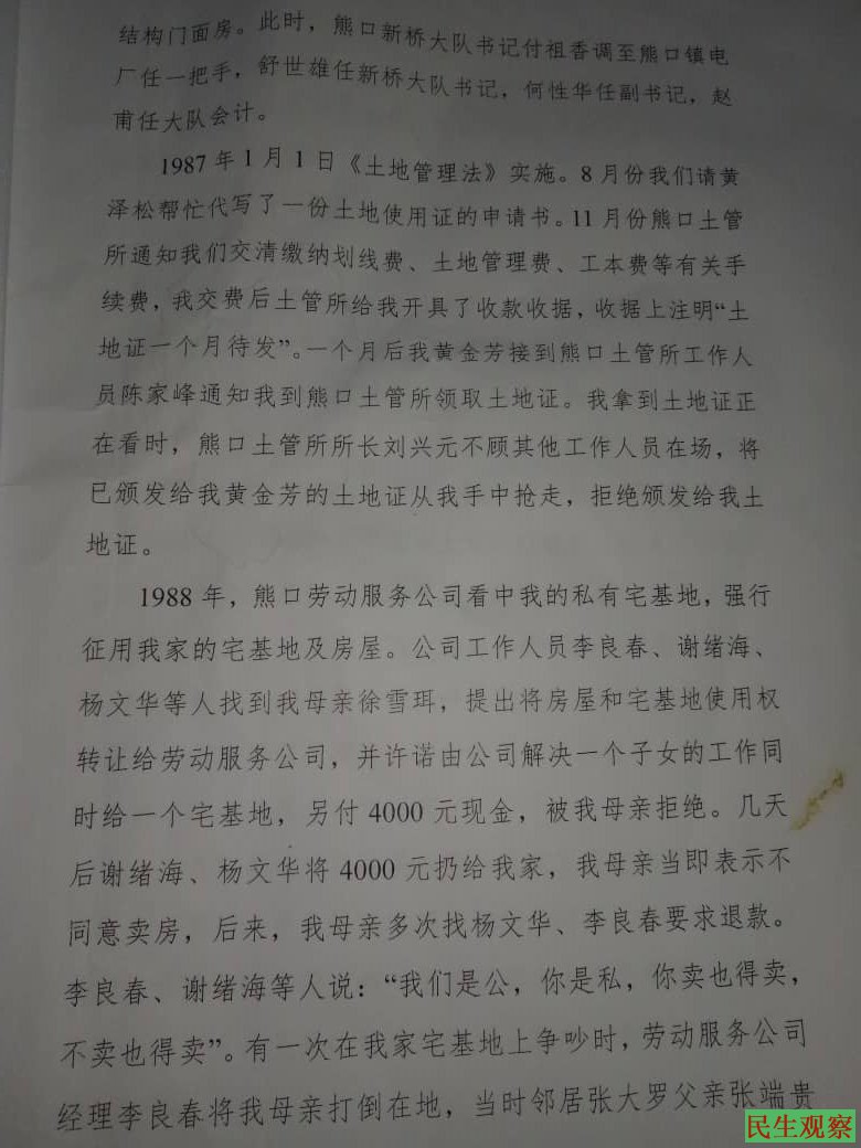 土地证被非法掠夺后,黄金芳一家战战兢兢的在自己亲手搭建的房子住着,到了1988年熊口劳动服务公司看中黄金芳的宅基地,强行征用了宅基地及房屋,没有任何合法的手续强行将黄金芳的房屋转让给劳动服务公司,并承诺又劳动服务公司解决一个子女的工作,同时再补一个建房宅基地,强行用4000元现金将黄金芳一家大大小小再次让他们无家可归。