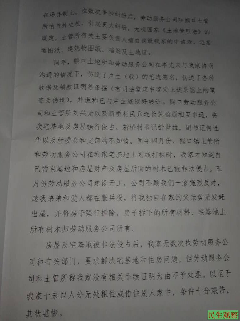 潜江熊口土管所与劳动服务公司勾结,伪造了各种收据以及黄金芳的笔迹等多种相关转让手续,他们官官相护,权钱交易,野蛮的把独自在家我老人赶出房子,当时黄金芳的弟弟与爱人都在服兵役,强行把房子被强坼了,强坼所有房子的建筑材料,还有宅基地上所有树木全部归劳动服务公司所有,瞬间黄金芳家变得一无所有,无家可归流离失所。