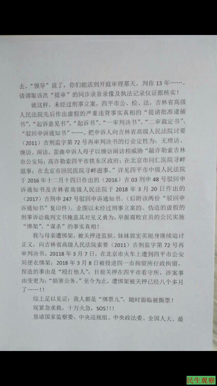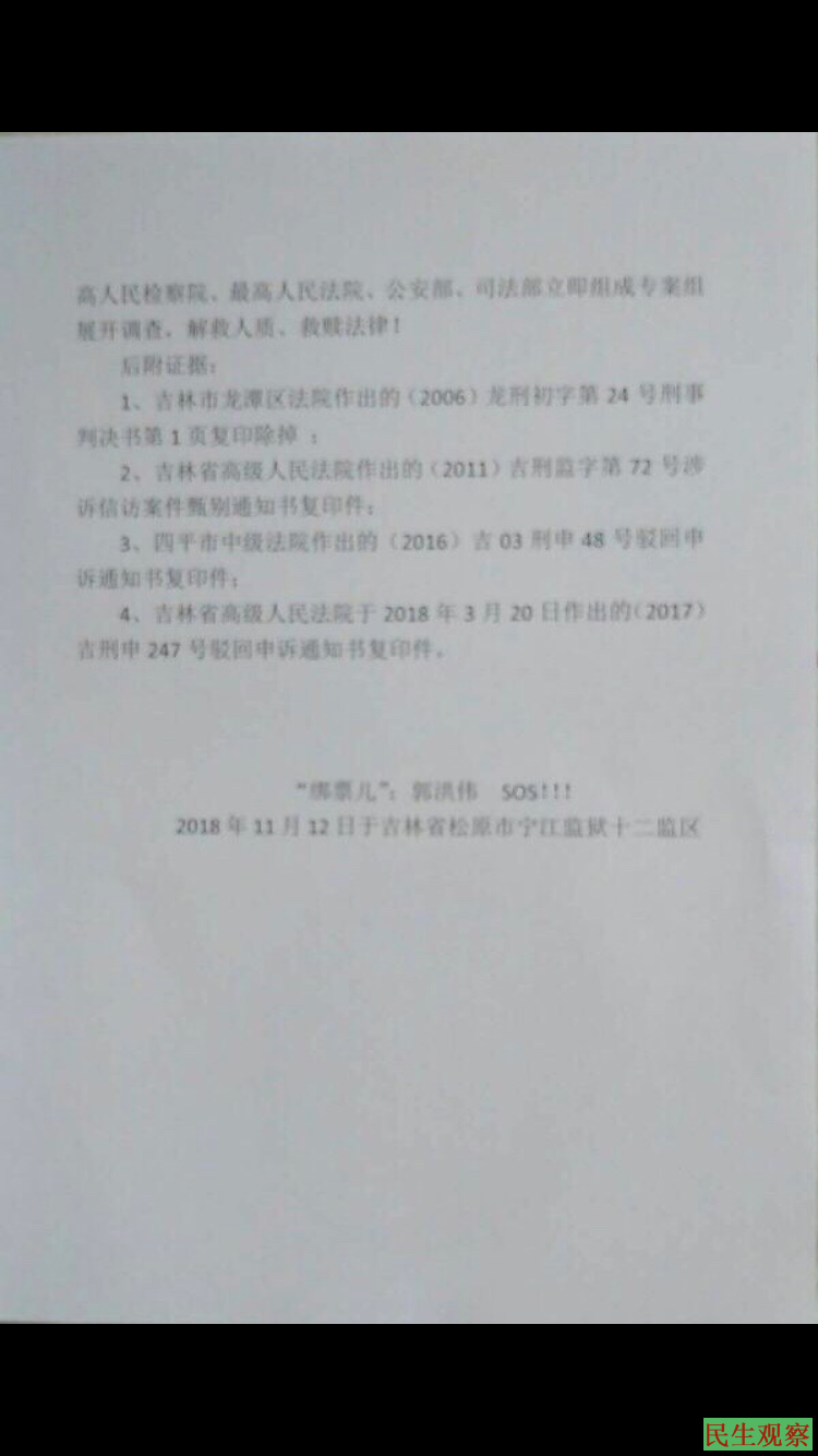 【民生观察2019年12月18日消息】郭宏伟在监狱已经度过了第四个年头。2015年3月郭宏伟被吉林市政府人员及警察的陪同下,来到北京信访。嗣后,回到吉林被以敲诈勒索罪关押,最终被构陷判刑十三年。