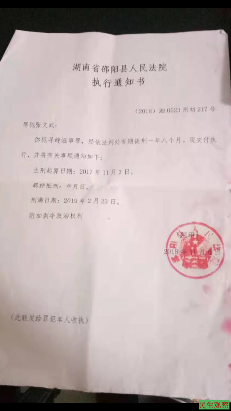 【民生观察2019年2月23日消息】曾因网上发帖而被控”寻衅滋事”刑拘并一度中断消息的湖南邵阳宗教人士释大成(俗家姓名:张文武)法师于今日(2月23日周六)上午刑满获释,已回到家中与亲人团聚。