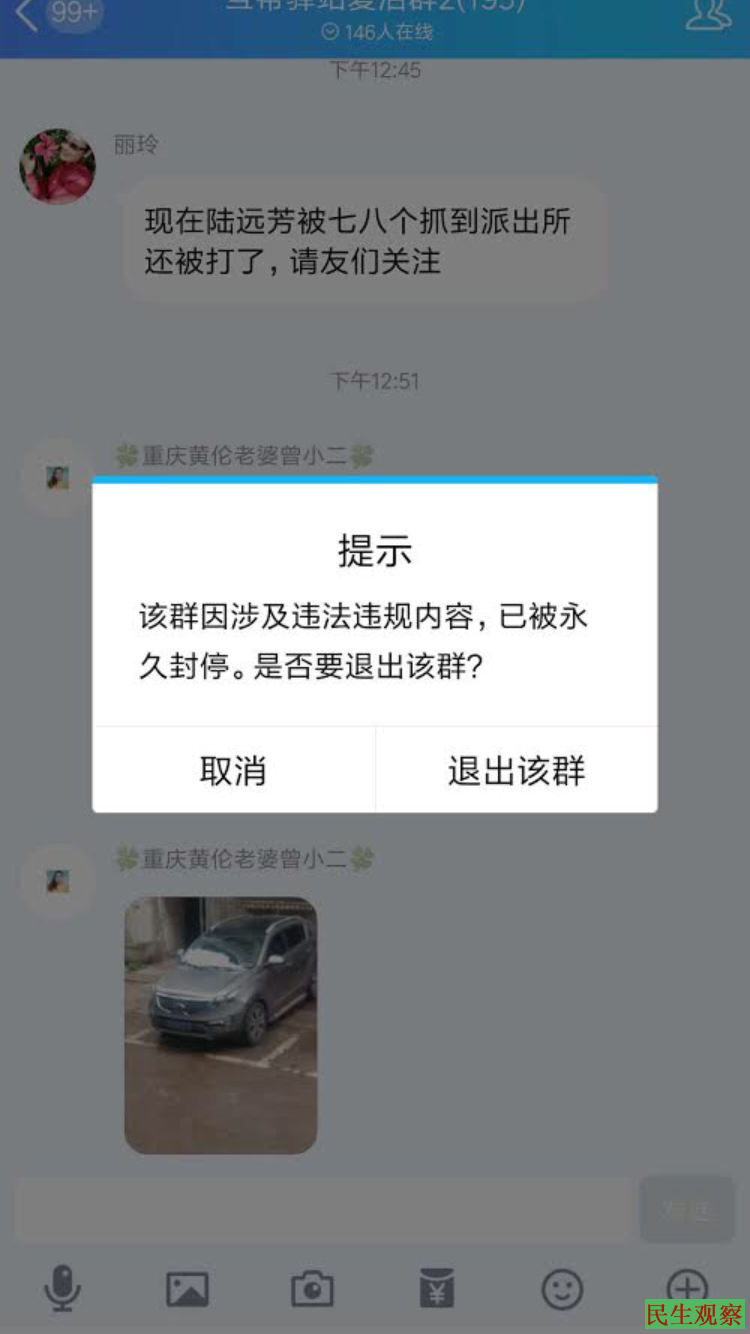 【民生观察2019年4月15日消息】今天4月15日是第四个全民国家安全教育日,据说国家最高领导人昨天已到达重庆市,而重庆当地众多维权人士家门则被上岗,被限制出行自由,还有维权人士遭到殴打,重庆地方维权群已被永久封停。