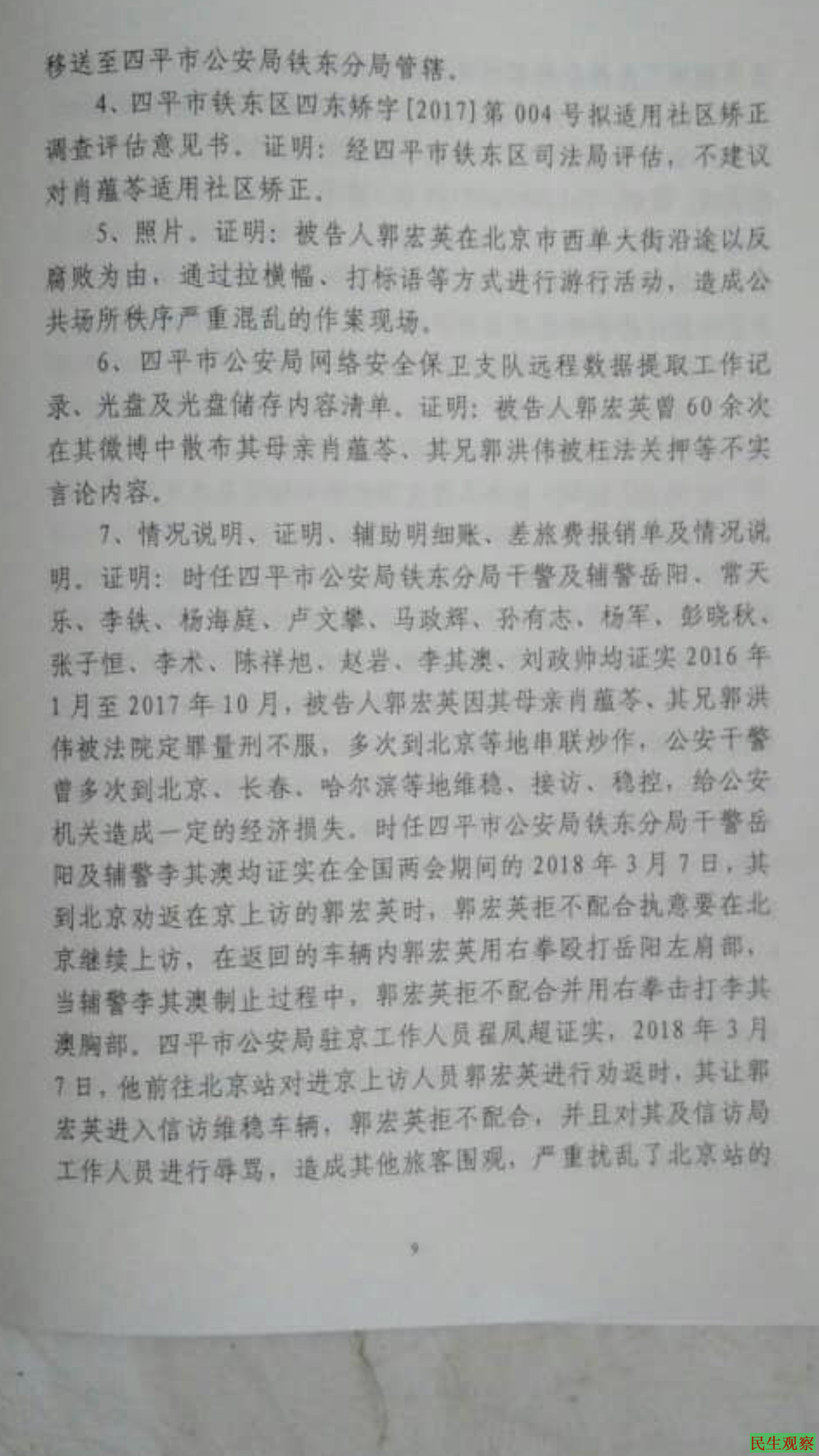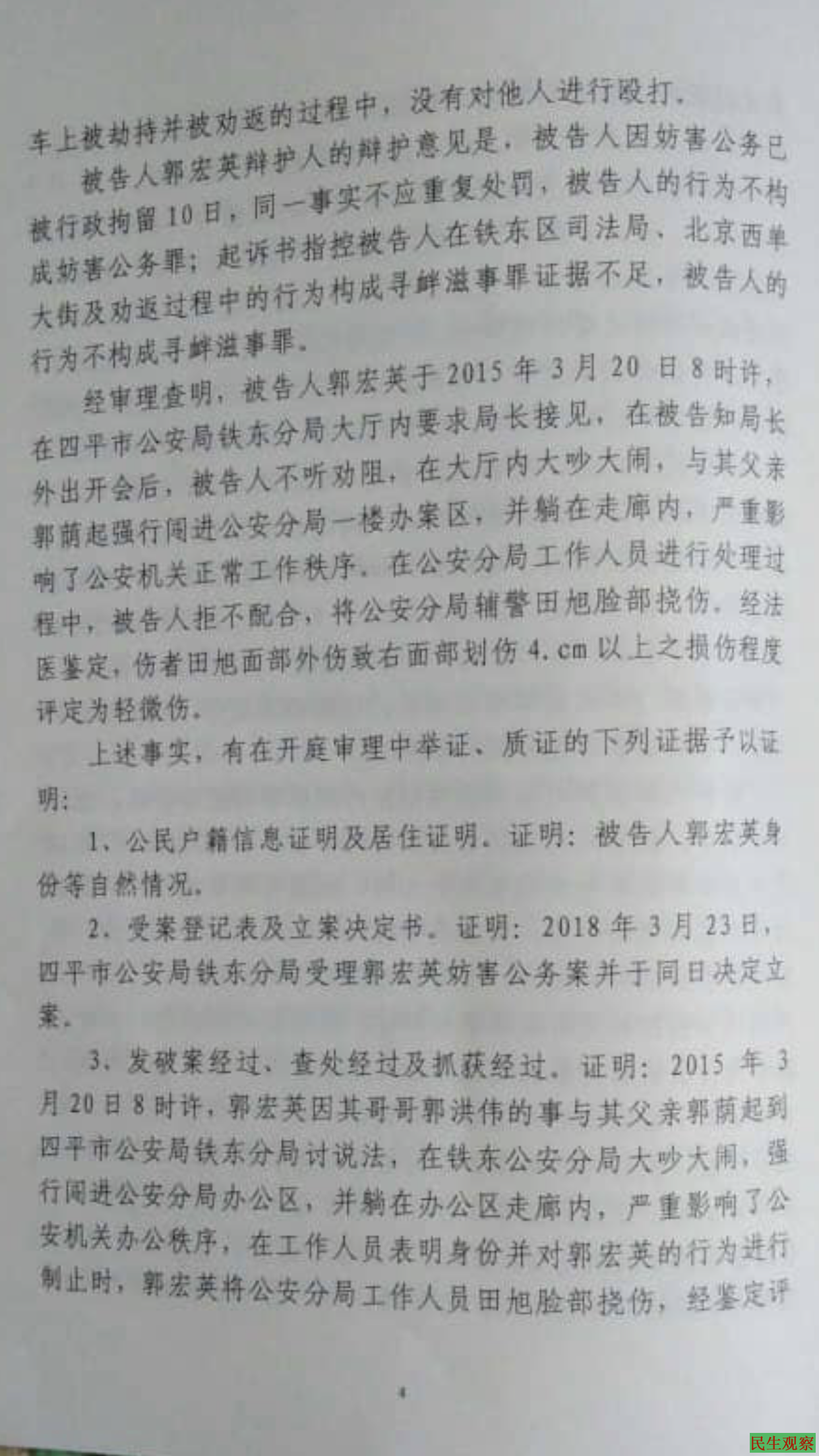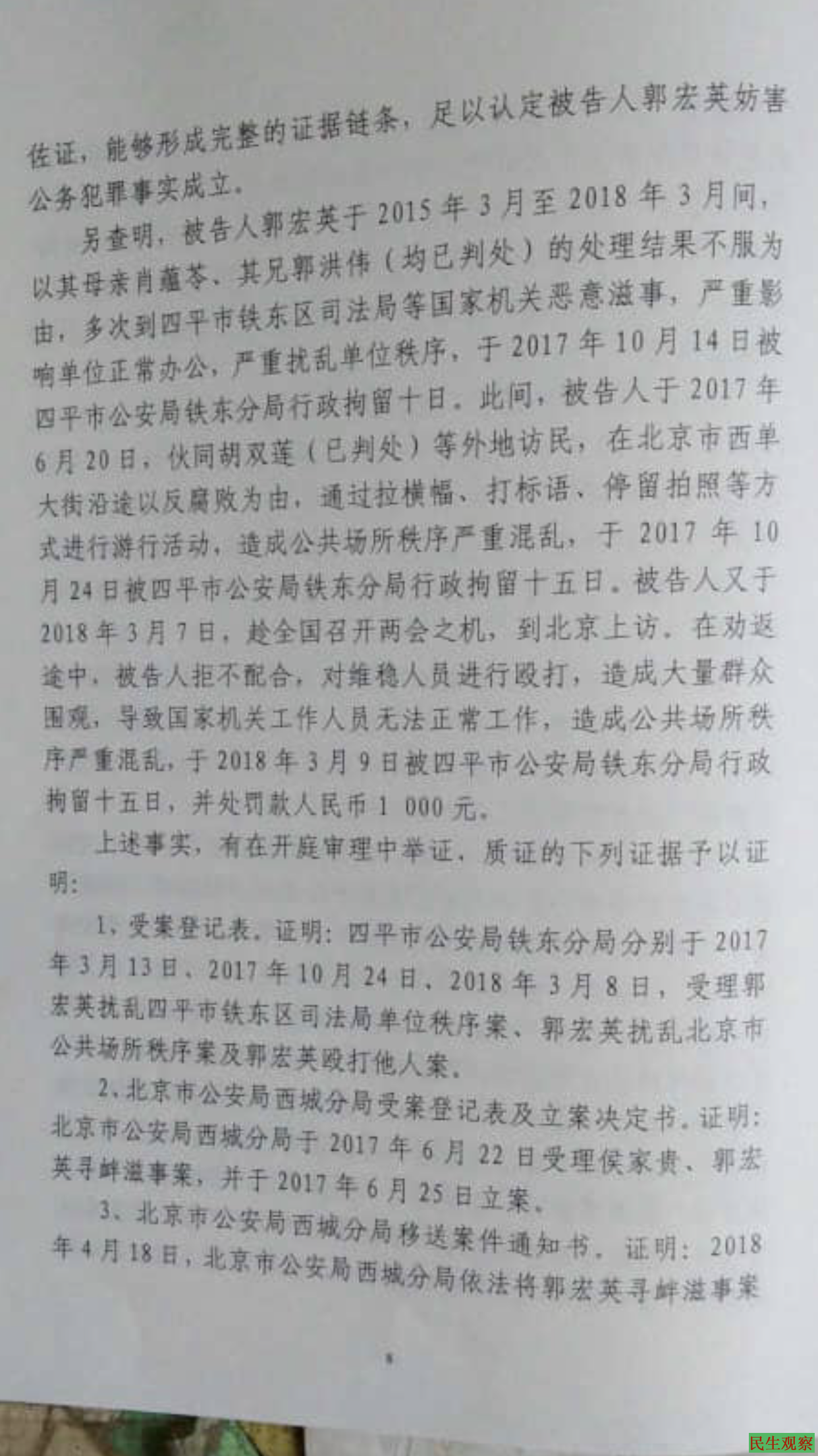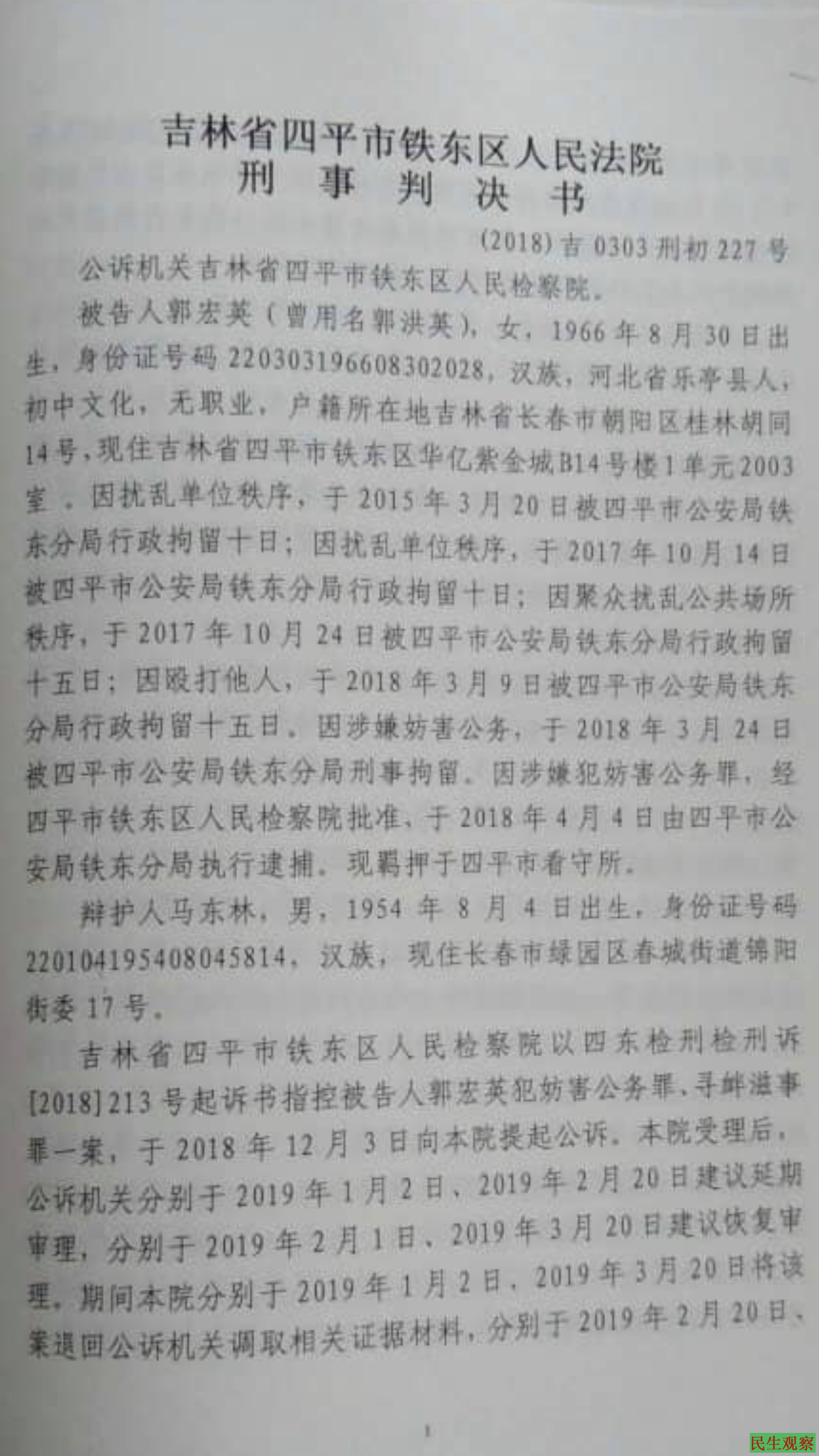 吉林四平公民郭宏英女士涉嫌寻衅滋事、妨害公务案一审,将于2019年4月18日在四平市铁东区法院开庭。郭宏英因对其母肖蕴芩,其兄郭洪伟被重判不服,坚持申诉,继其母兄系狱,目前仅八十多岁父亲孑然在外,苦苦守候。一门三被诉,此案堪称东北乃至全国范围内在诉的对访民进行打压的典型案例。