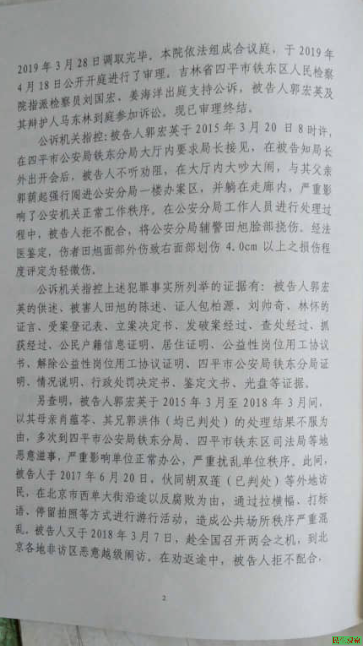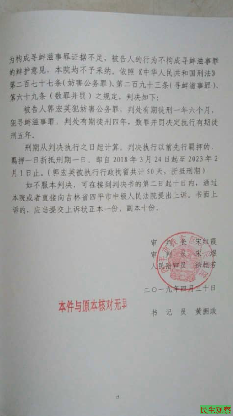 【民生观察2019年5月6日消息】备受社会关注的吉林四平郭宏伟一家三口遭到当局重判,高位瘫痪的郭宏伟被当局重判十三年,母亲已经80岁被重判六年,2019-4-30号郭宏英被重判,以妨碍公务罪判刑一年六个月,寻衅滋事罪判刑四年,两罪并罚施行五年实刑。