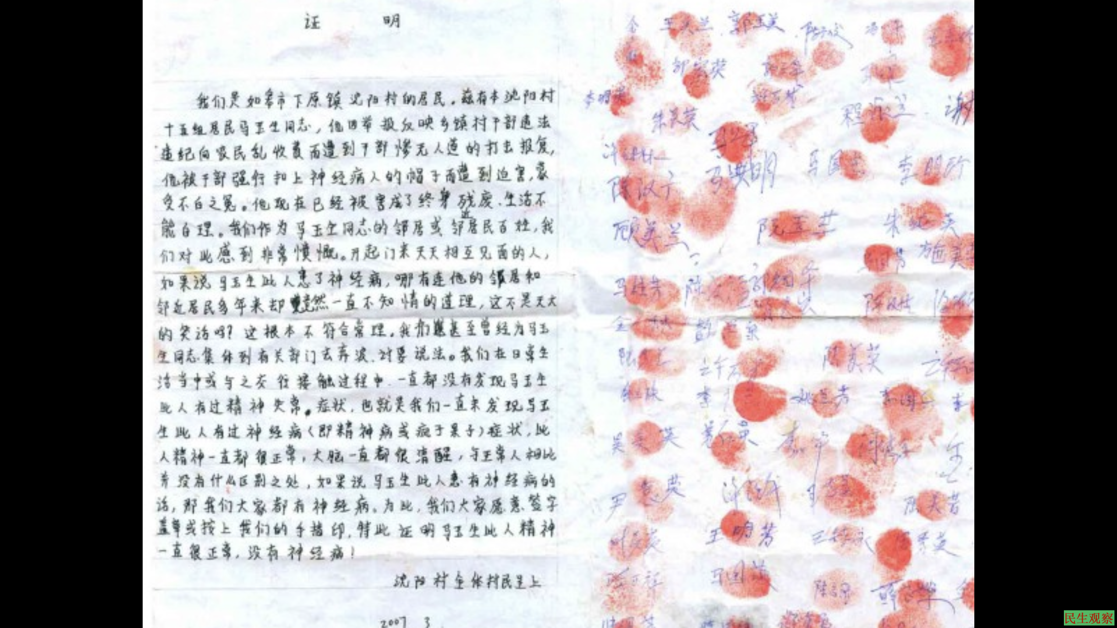 我叫马玉生,男,汉族,1969年生,高一文化,家住江苏省如皋市下原镇沈阳村十五组。我是一个农民。多年来,中央三令五申,不能加重农民负担,要给农民减负……但恰恰相反,在我地,一直以来,农民负担却不减反增,当地干部年年巧立名目,变本加厉,利用各种名义层层加码,年年大幅度加重农民负担。