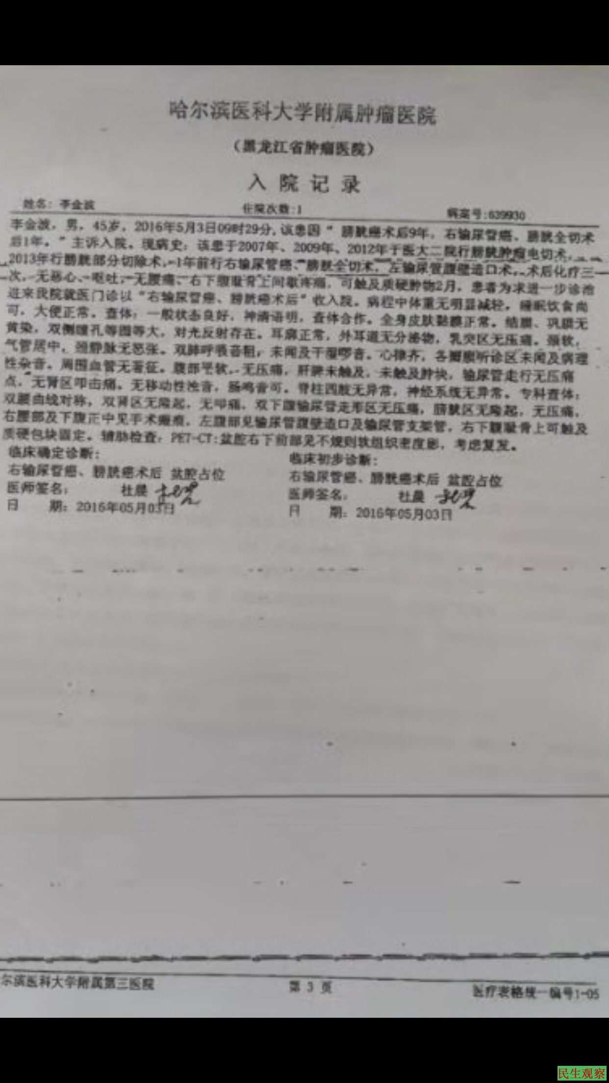 (二)另据其家属提供的黑龙江省农垦总医院黑龙江省第二肿瘤医院2016年4月27日李金波PET-CT影像报告的诊断意见:膀胱癌、右侧输尿管癌术后,右肾及右侧输尿管根治性切除术,膀胱全切、左侧输尿管腹壁造口术后、右肾缺如、膀胱缺如;左肾盂左侧输尿管至左腹壁见条形管状影引流至体外,考虑术后改变。