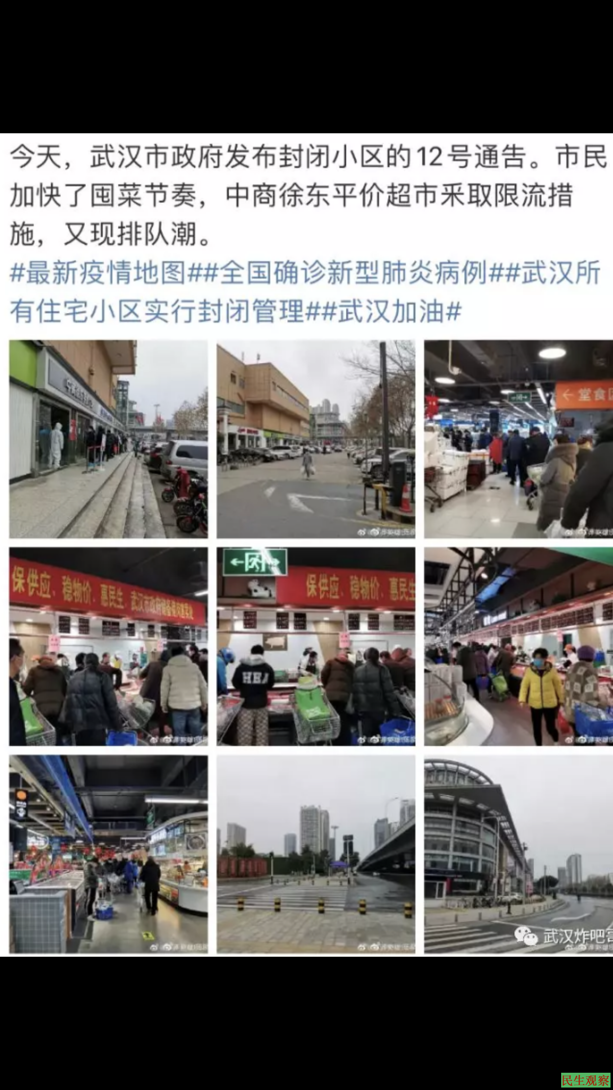 据武汉网民“武汉炸吧哥”反映,2月11日凌晨,武汉发布了全部小区封闭管理的公告。严格的隔离措施虽然来的有点晚,但仍然是积极的措施,可是,最最重要的问题,我们没有找到如何解决购物的答案,市政府只宣布了封闭管理,却没有给出如何购物的答案。他们只管严厉封闭,不管市民如何采购的问题。