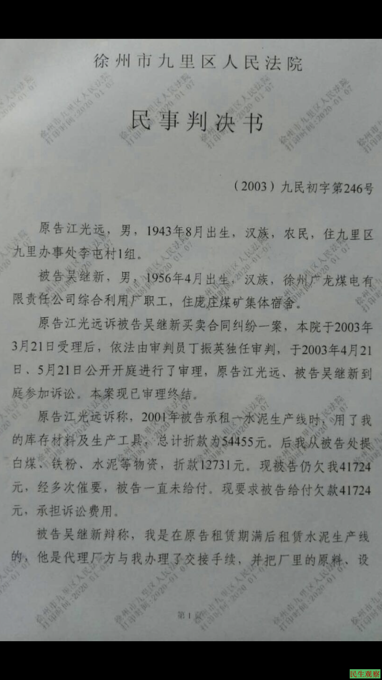 就在吴继新期待退休养老金工资的同时,让他担心的一件事使他非常担忧,吴继新另外一个信访案件的问题,在2003年4月21日九里法院开庭审理江光远和吴继新的案件过程中,当时吴继新给法院提出起诉主体不对,因为吴继新是租赁徐州华泰混凝土外加剂厂的小型水泥车间期满,按法律法规定应该起诉徐州华泰混凝土外加剂厂,应该把吴继新作为第二破告。当时吴继新向丁振英法官提到这个法律问题他应该是第二被告不是第一被告,丁振英法官对江光远说:吴继新懂法。丁振英法官又对吴继新说:我们判决完后在到厂里去拆设备,吴继新在这样被欺骗的情况下同意开庭审理了。