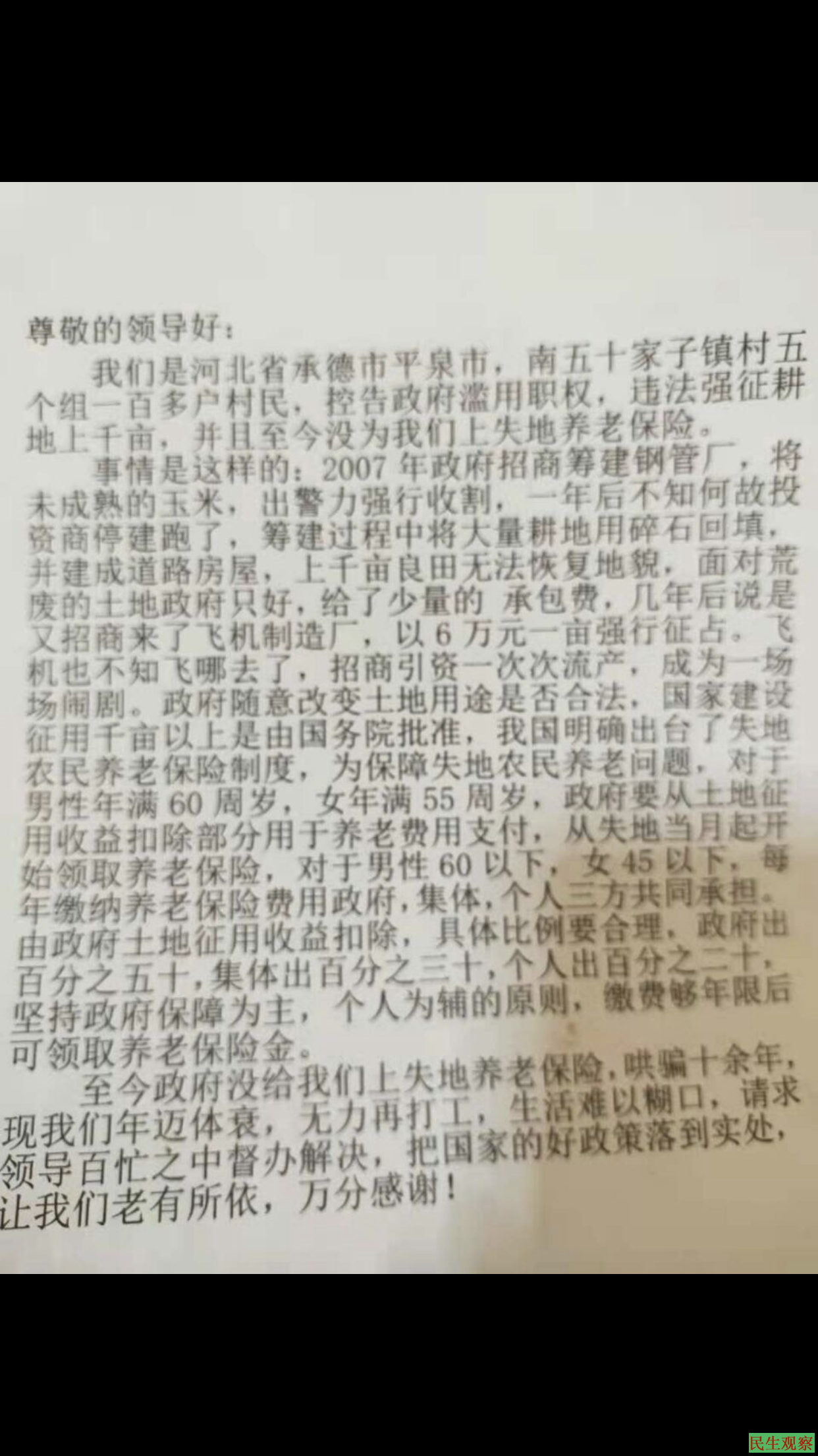 【民生观察2020年11月28日消息】赵春红河北平泉人,这次来京申请游行示威,是涉及河北平泉的100多户失地农民养老权益问题,政府没有依约解决养老保险待遇。平泉政府在2007强征南五十家子耕地三千亩,没用审批手续。依据当时已及现有的土地管理政策,征地几百亩就要经国务院审批,但此征地是没有得经过国务院的批准。征地的发生已经有十几年了,上百户的农民养老问题得不到解决。