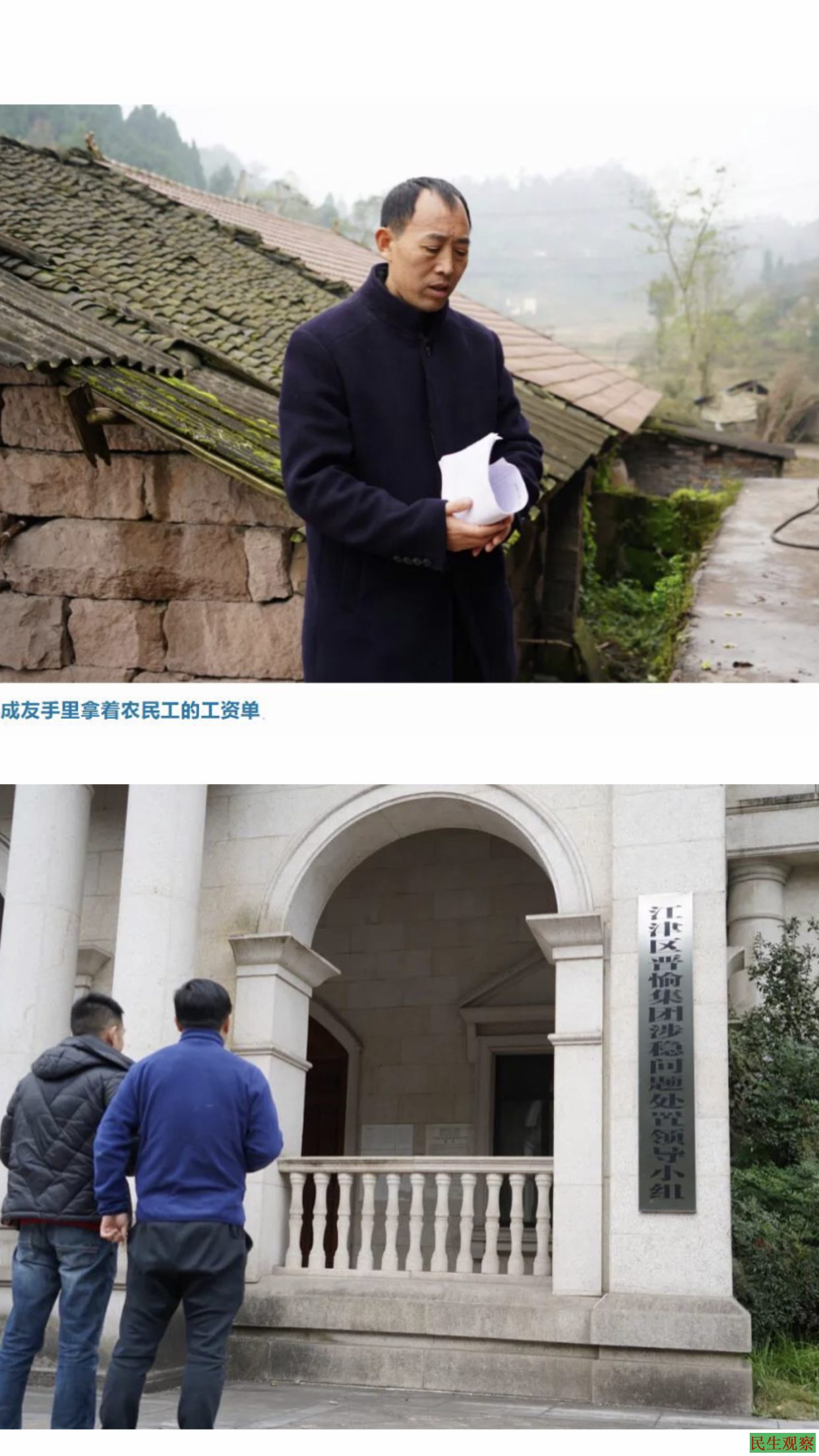 4、孙成友的亲哥孙成万也是直到去世都没拿回钱。孙成万于2017年查出癌症,做检查、治疗的钱大部分都是到处东拼西凑借的。他和老婆杨春梅一共有28万元的工钱没讨回。孙成友告诉网友,由于拿不回工钱,他自己都前前后后垫了300多万元发给手下的工人,有一百多万还是把自己房子做抵押去贷的。“但后来实在垫不起了,搞得我儿子对象都不好找,别人会说他家欠一屁股债。”此外,因为欠薪导致多家施工单位停摆,单位负责人讨薪还成了政府的“维稳对象”。晋愉地产各开发楼盘的施工单位、材料供应商、劳务班组,多年未收到应收的工程款,陷入困境。仅一级承包商便有18家,涉及数百家分包商,涉及未付工程款约11亿元。2020年10月,一些债权人写信给中央巡视组,反映自己的困苦。“我们无论是通过司法手段还是政府信访,都没有结果,迫于无奈向您们举报。”在这份名为《关于对重庆晋愉地产集团遗留问题工作不作为、慢作为、乱作为的举报》信上,他们写道:“从2015年开始,我们开始了漫长的讨要工程款的历程。找政府,政府告诉我们去诉讼;诉讼胜诉后找法院要求执行,又被告知要等政府统一处置或者查无可执行财产。盛世融城、大岭湖项目资产已经被非法集资、银行等瓜分,成千上万的农民工苦苦熬了近6年,眼看就要血本无归。”