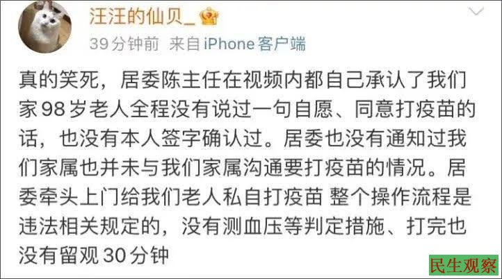 事情详细经过是,居委工作人员带着医生,没有通知老人的家属,上门给98岁的老人打疫苗。