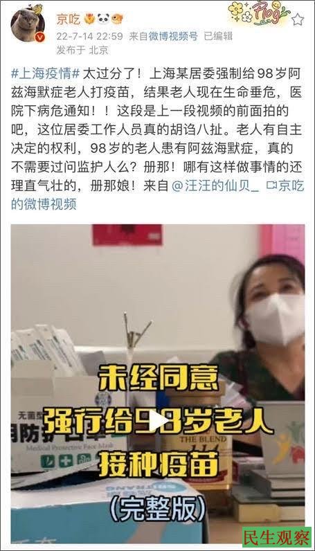2022年7月18日微博大V爆料,上海某居委会私自上门,强制给98岁老人接种疫苗,结果老人生命垂危,被医院下了病危通知书。