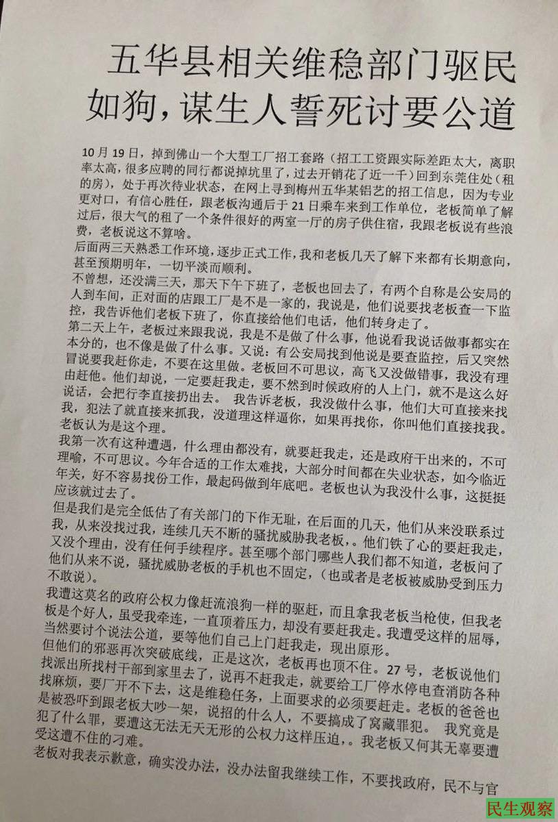 但他们的邪恶再次突破底线,正是这次,老板再也顶不住。27号,老板说他们找派出所找村干部到家里去了,说再不赶我走,就要给工厂停永停电查消防各种找麻烦,要厂开不下去,这是维稳任务,上面要求的必须要赶走。老板的爸爸也是被恐吓到跟老板大吵一架,说招的什么人,不要搞成了窝藏罪犯。我究竟是犯了什么罪,要遭这无法无天无形的公权力这样压迫,,我老板又何其无辜要遭受这遭不住的刁难。