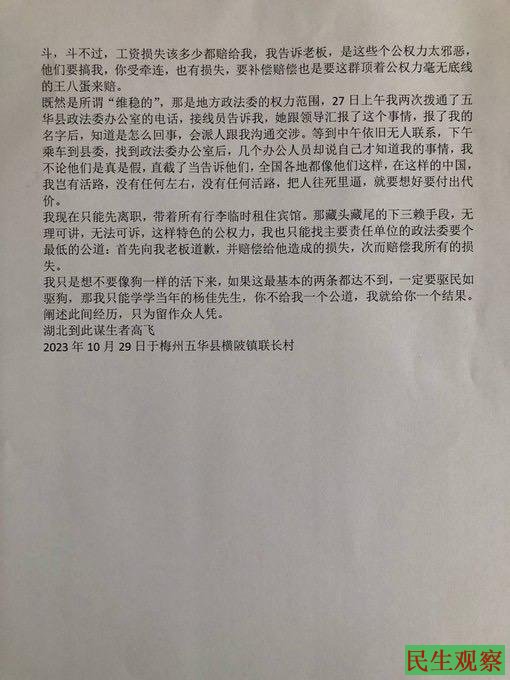 2023年10月29日,高飞在网上公开发表声明,称梅州五华县相关维稳部门驱民如驱狗,自己作为谋生人誓死要讨一个公道。