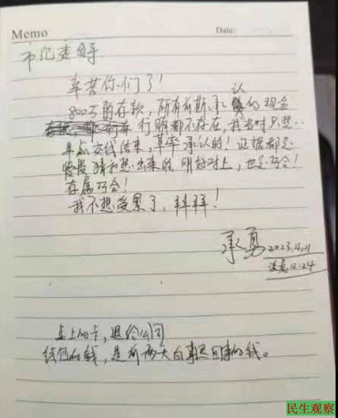 “常州华立”原推送消息附有承勇手写遗书,内容和该朋友圈类似,并称:“证据都是慢慢猜和想出来的,刚好对上,也是巧合!纯属巧合!“落款时间为11月11日凌晨12点24分。