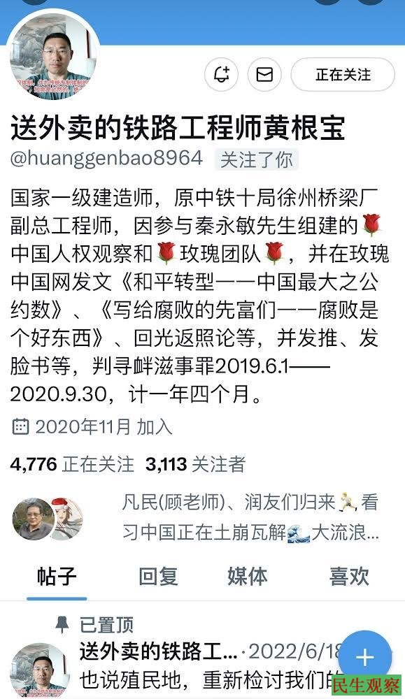 据悉,黄根宝,江苏省徐州市公民,国家一级建造师,原为央企中铁十局徐州桥梁厂副总工程师,因参与秦永敏先生组建的中国人权观察和玫瑰团队,并在玫瑰中国网发文《和平转型一一中国最大之公约数》、《写给腐败的先富们——腐败是个好东西》、回光返照论等,并在推特、脸书上发表。