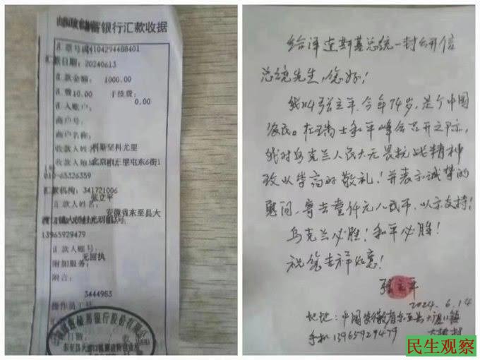 我叫张立平,今年74岁,是中国农民。在瑞士和平峰会召开之际,我对乌克兰人民大无畏抗战精神致以崇高的敬礼!并表示诚挚的慰问,寄去壹仟元人民币,以示支持!