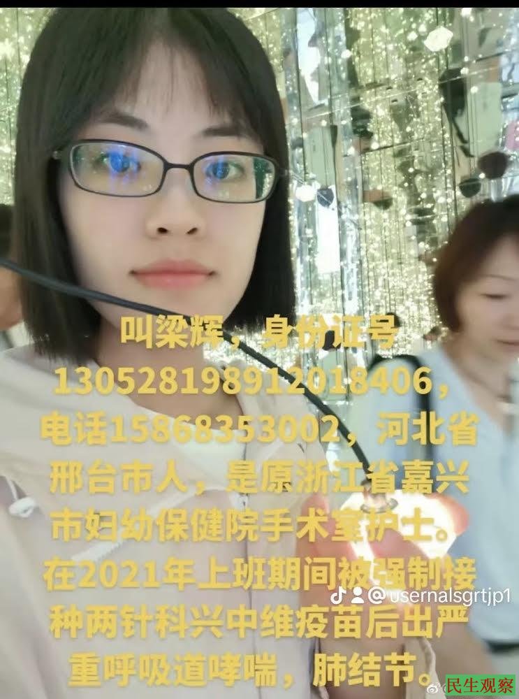 【民生观察2024年9月25日消息】2024年9月24日,前浙江嘉兴市妇幼保健院护士梁辉发文控诉,三年前自己被强制注射了新冠疫苗,后引发严重呼吸道过敏反应,之后病情逐渐加重,导致无法治愈的情况。现如今的梁辉处于身体极度痛苦,精神已经崩溃,积蓄已经花光,生活无以为继的恶劣状态。
