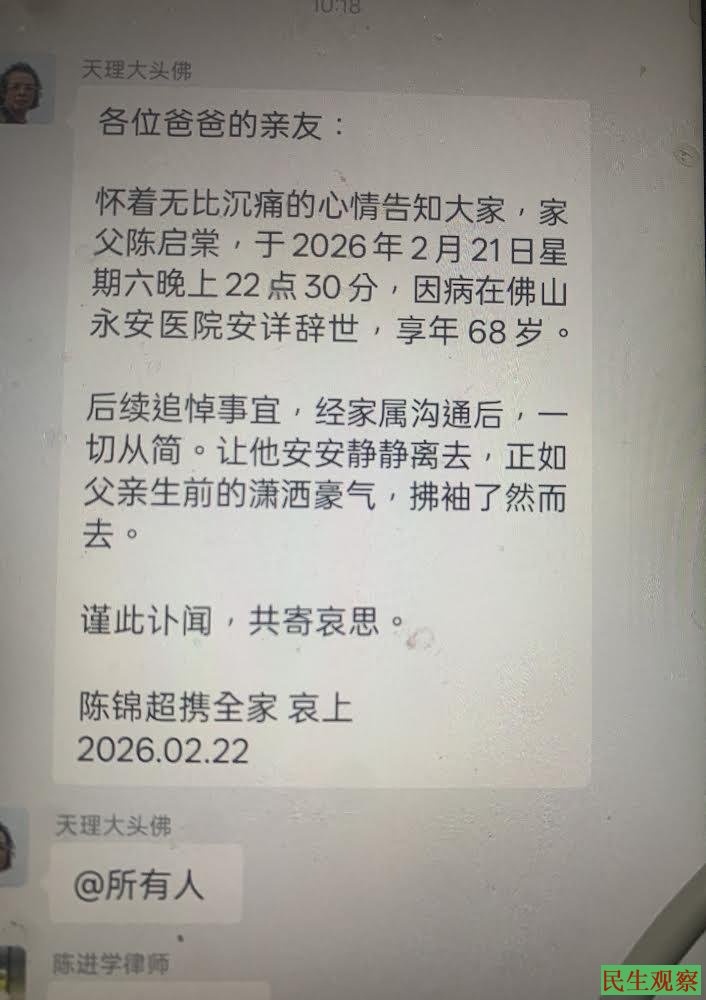 【民生观察2026年2月23日消息】广东佛山维权人士陈启棠(网名天理),因患肺癌晚期,于近日在佛山永安医院去世,众多亲朋好友发文悼念。陈启棠曾因关注公共事务,被广东当局以煽动颠覆国家政权罪判处有期徒刑四年半,于2019年5月获释。
