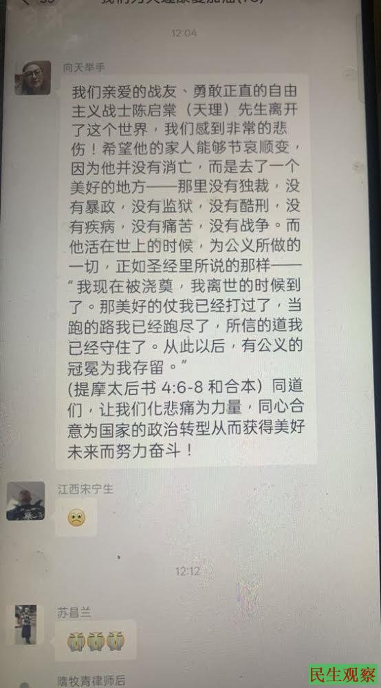 网友“向天举手”今日发文悼念:我们亲爱的战友、勇敢正直的自由主义战士陈启棠(天理)先生离开了这个世界,我们感到非常的悲伤!希望他的家人能够节哀顺变,因为他并没有消亡,而是去了一个美好的地方——那里没有独裁,没有暴政,没有监狱,没有酷刑,没有疾病,没有痛苦,没有战争。而他活在世上的时候,为公义所做的一切,正如圣经里所说的那样——“我现在被浇奠,我离世的时候到了。那美好的仗我已经打过了,当跑的路我已经跑尽了,所信的道我已经守住了。从此以后,有公义的冠冕为我存留。”