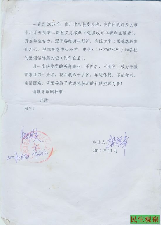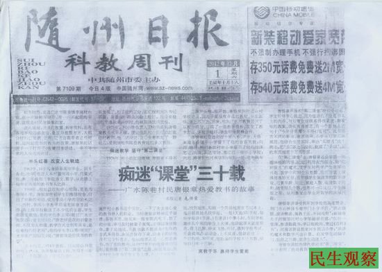 民生观察工作室2013-7-1消息:近日,本工作室接到湖北省广水市民办教师唐银章的大量材料,唐老师反映,1964年他开始在广水市农村任民办教师,1974年,因别人偷了红苕,给了半头他吃,他被辞退回家。