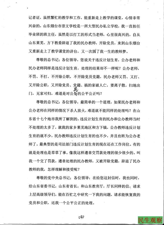 山东曹振兰“超生”遭抄家罚款 重复处理任教二十多年被辞退