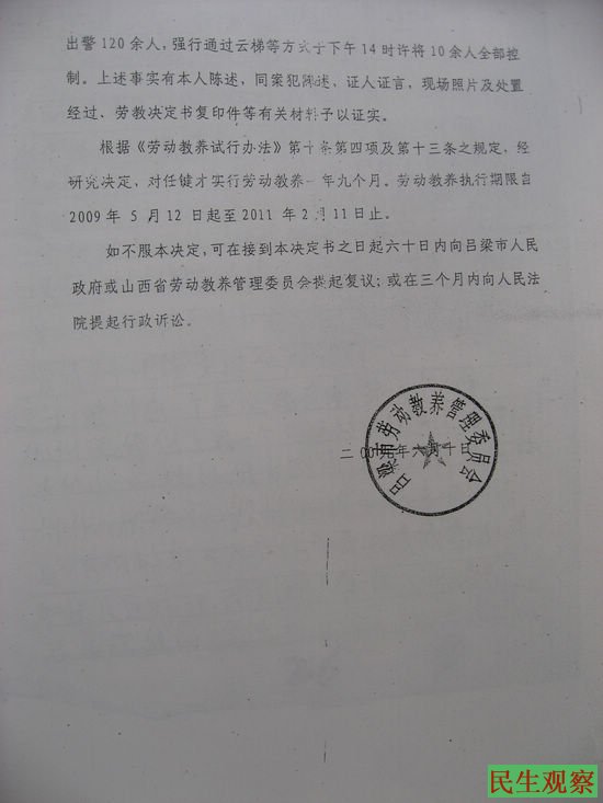 2009年5月12日,任建财又被石楼公安局从北京带回,因“聚众扰乱公共秩序罪”劳教一年九个月,至2011年2月11日止,而这次快出来的时候,任建财还被送到了山西省精神病医院半个月的时间,医生给他检查了好几次,就是没发觉有毛病,但是在里面照样要吃药,任建财拿烟给被罩上烫了个洞,把每次吃的要装进去来应对医生检查,由于任建财在里面一直闹绝食,医生要给他每天灌三次的玉米糊糊,加上劳教期限的临近,他终于被放了出来。