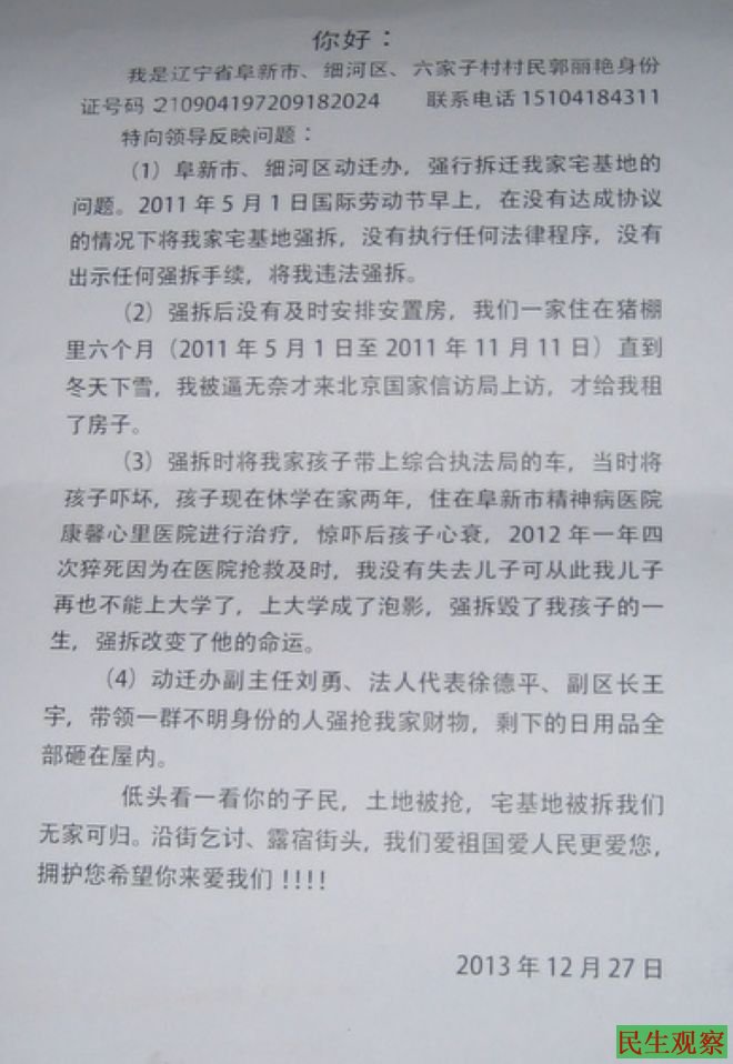 民生观察工作室2013-12-30消息:昨天上午,本工作室志愿者见到来北京上访的辽宁省阜新市郭丽艳女士,郭女士家里的房屋在二年半前被当地政府强行拆除,并将郭女士打伤,当时还在上高二的儿子目睹亲人被殴、房屋被毁后,出现后遗症,后在精神病院治疗。