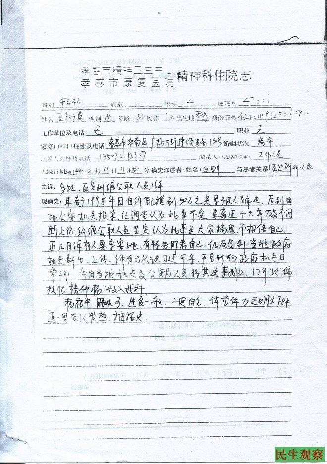 湖北孝感王树英“病历”曝光 坚决提告公安、精神病院