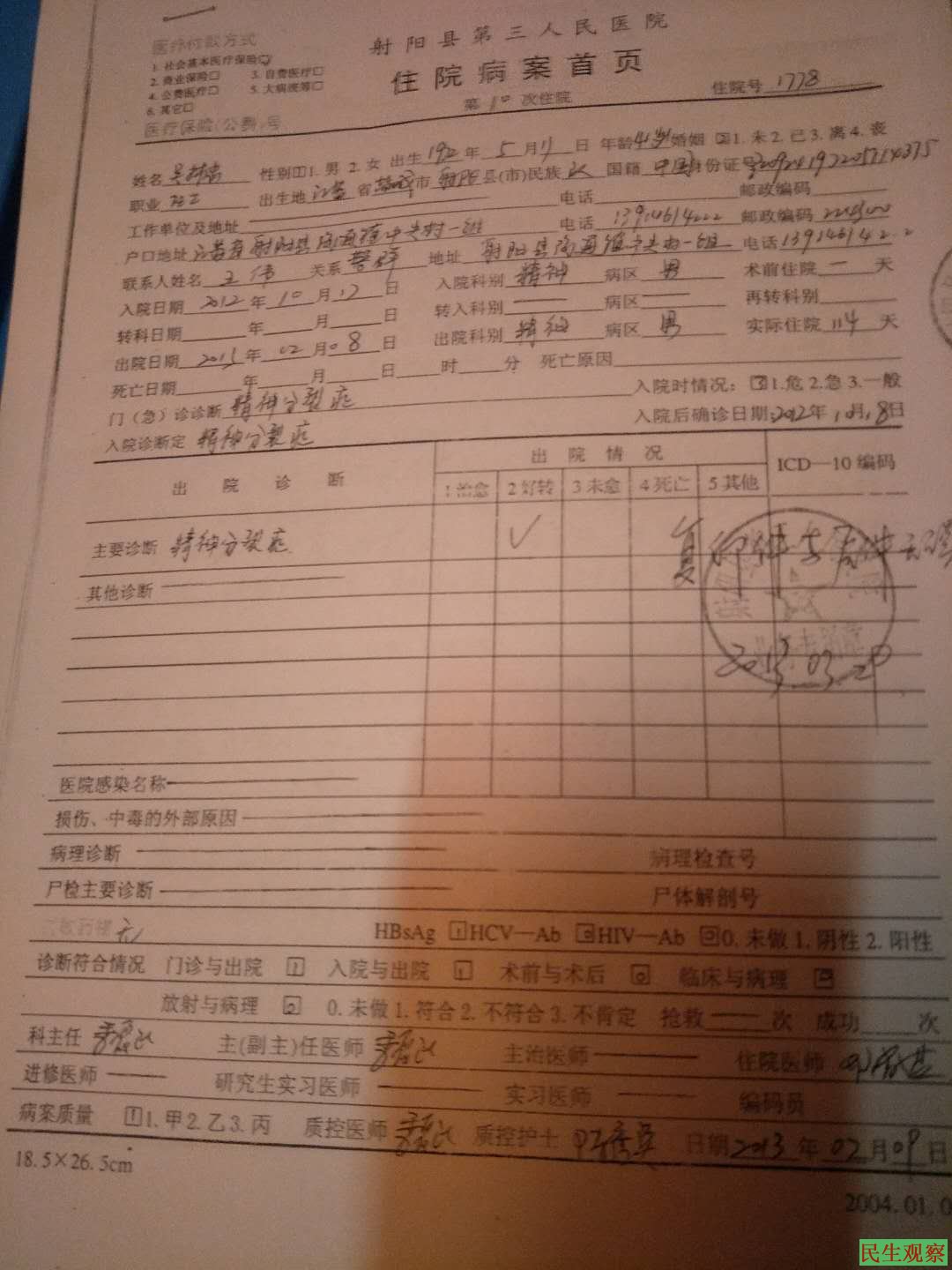 在中医院住院治疗期间,每天都有派出所便衣人员24小时盯着他,2012年10月17日,在他的手臂伤势还未痊愈的情况下,他又被强行押送到射阳县第三人民医院精神科关押。从而造成他的手臂感染发炎,留下了诸多后遗症。