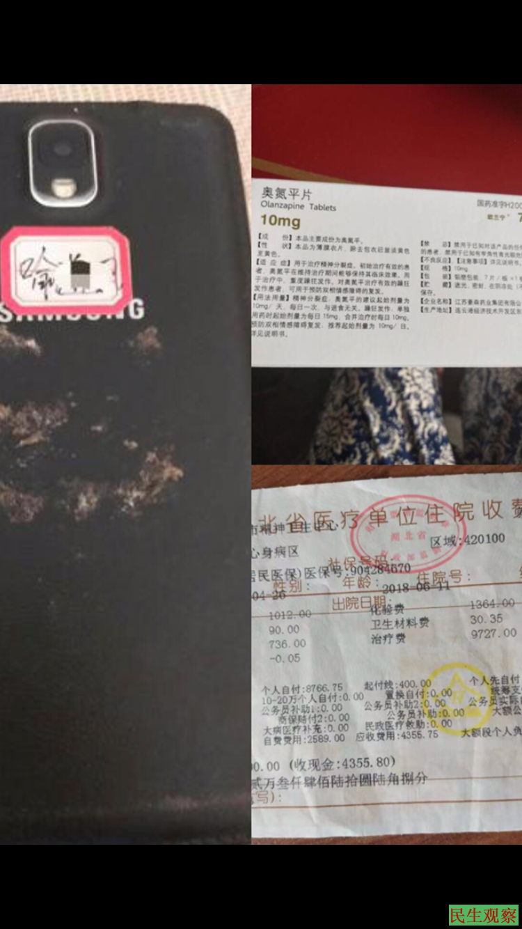 在私立武中医院里主治医师是一个年轻的女医生,在开始三天时间里她来“查房”,很认真的听喻凤诉说,但她也只能说:到我们这来就必须“按程序走”,也就是“强制性捆绑”“制约性治疗”。她们走出门口时,喻凤听到年轻女医生对同行的医生说“她思路清晰得很”!第二天查完房她们三个医生走到门口略带惋惜又议论起来“她思路清晰得很!”终于消息传到喻凤娘家,在她弟弟和侄儿交了1.5万并求情后终于在4月26日把喻凤救出来。并开具诊断证明:双向情感障碍。此时喻凤已被酷刑捆绑“救治”长达15天之久。喻凤听隔壁吸毒贩毒人说,抓一个贩毒吸毒或精神病的,每个人的家属大约只要交1.5万左右立马放人,没钱交的有的关押一年或半年,有的没钱关很长时间,有的刚刚捆绑后5分钟,家属交钱来就放人了。一个目的:抓人整人捞钱!