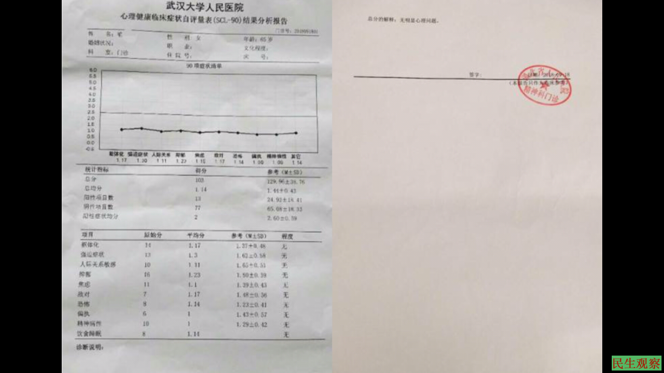 9月18日,喻凤到湖北省人民医院精神科测试,结果分析,各项指标均正常,总分达103分,解释为:无明显心理障碍。与武汉市精神卫生中心作出的诊断完全不同。(见医院报告单)