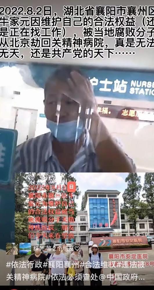 在家属的陪同下,五六位维权人士隔着封锁的钢化玻璃门与牛家元老先生交谈了一会儿。牛家元老先生告诉朋友们,自己是前天在北京找工作时,被襄阳市维稳办人员绑架回来的,绑架的过程中政府维稳人员暴力殴打了他,导致他头顶至今仍有一大块肿包。绑架回襄阳市后,他们并没有送他回家,而是经过一番审讯后,强制把自己押送到了精神病医院关押。