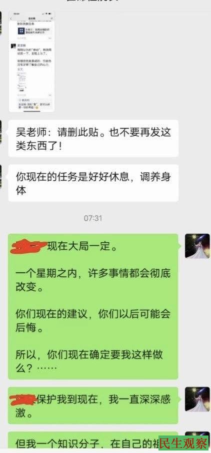 据吴老师和学校相关人士的对话截屏显示,吴老师被要求删除上述言论。被要求不要再发这类东西了!说她现在的任务是好好休息,调养身体。