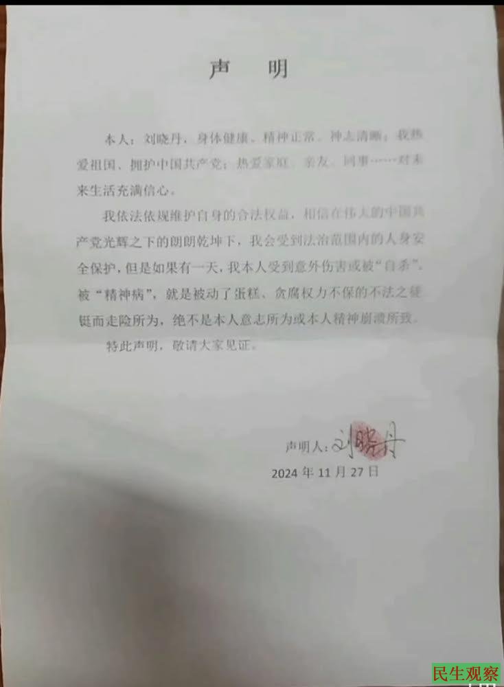 为此,刘晓丹实名控诉哈尔滨市公安局南岗分局局长:肖景涛、哈尔滨市南岗区文化街派出所所长:周象菲、哈尔滨市南岗区文化街道办事处工委会副书记:李连晶、哈尔滨市南岗区文桥社区书记:孙圆圆等人滥用职权,非法拘禁等违法犯罪行为,并于2025年9月22日、23日将此控告信递交到中共中央第三巡视组,但至今没有处理结果。