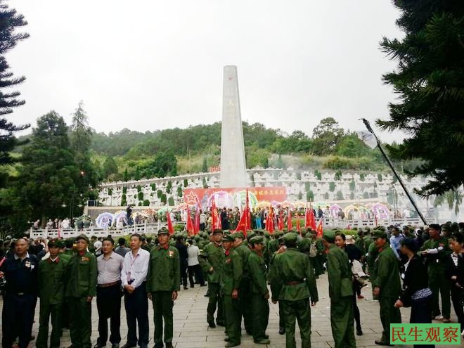 同样在今天上午,全国各地数千参战老兵、烈士家人赶赴云南省文山州麻栗坡县烈士陵园和老山主峰战场遗址进行公祭活动,为在老山战区而牺牲的战友扫墓。据现场人士介绍,公祭现场也是红旗招展。
