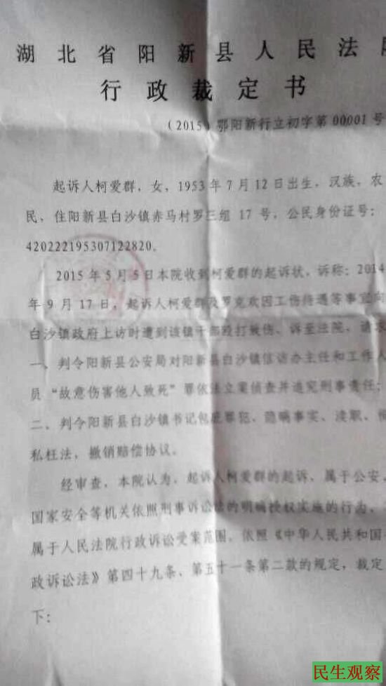 民生观察工作室2015-5-19消息:湖北省阳新县白沙镇访民柯爱群5月5日到阳新县法院要求撤销今年的3月11日在阳新县白沙镇人民政府胁迫下签订的《赔偿协议》,被县法院裁定驳回,不予受理。