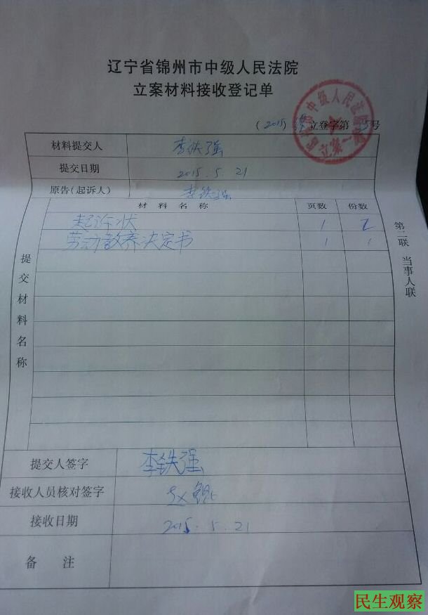 2015年5月1日,立案登记制度开始在中国法院实行,让李铁强看到了希望。5月21日,李铁强和锦州一起被劳教的访民高荣贤、王志文到锦州市中法就被劳教要求立案,法院虽然收下了材料,并因劳教委现已取消建议起诉锦州市政府,但仍表示不能当场立案,要到下周才能作出决定。