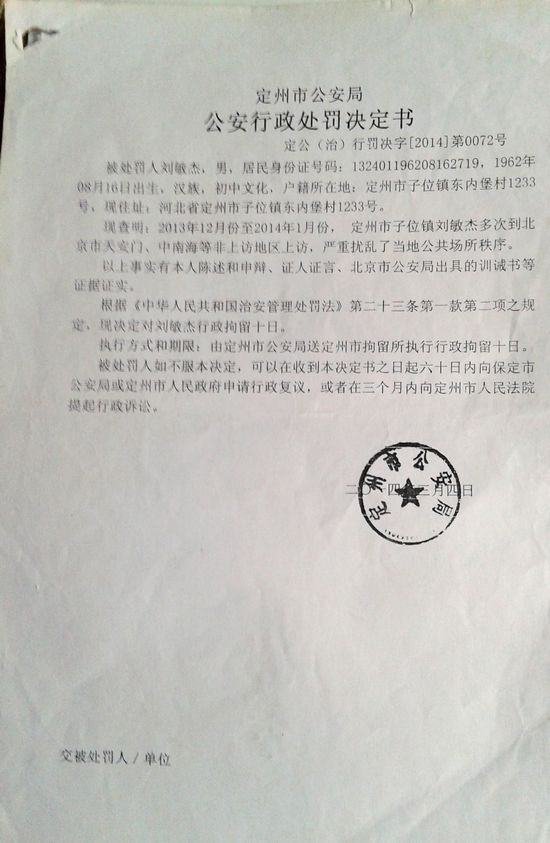 据悉,刘敏杰是因为儿子在新疆做生意时被同乡谋财害命,最高法在死刑复核时,改判凶手死缓,刘敏杰不服最高法判决进京上访被多次拘留,殴打,也曾被劳教。2014年3月4日,定州市公安局为了两会期间稳控刘敏杰不让其上访,以他2013年至14年间多次到天安门、中南海等地非访,扰乱其公共秩序为由将其行政拘留10天,刘敏杰对此不服向定州市政府申请复议,2014年8月29日定州市政府维持了定州市公安局的处理决定,复议决定书中称,