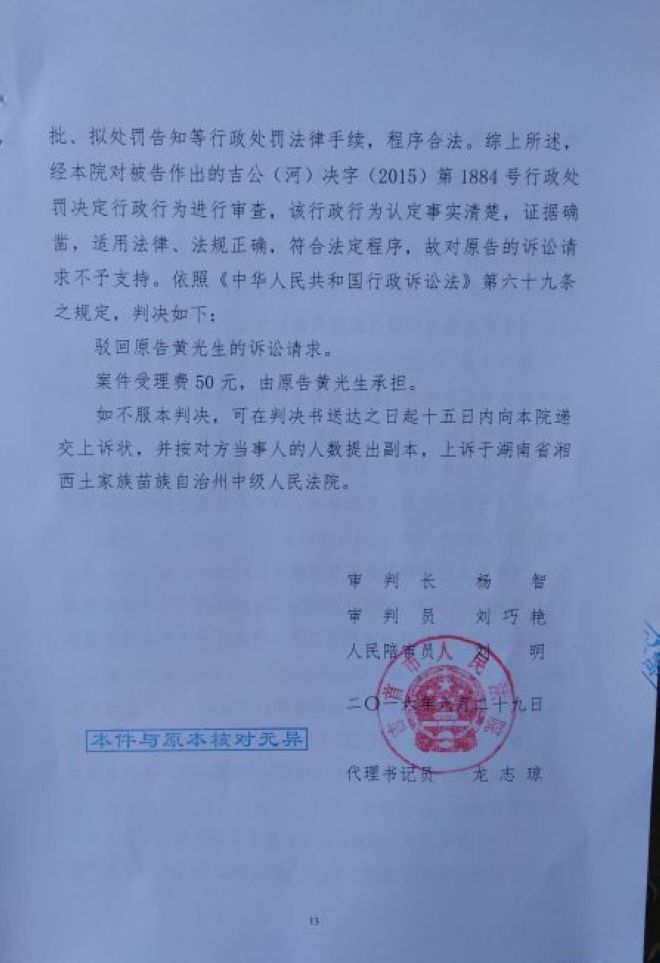 黄光生对此处罚不服,将吉首市公安局告上了法庭,案子好不容易获得了立案,今天吉首市法院对此案作出了判决。法院认为吉首市公安局处罚行为“事实清楚”“适用法律法规正确”,因此驳回了黄光生的诉讼请求。