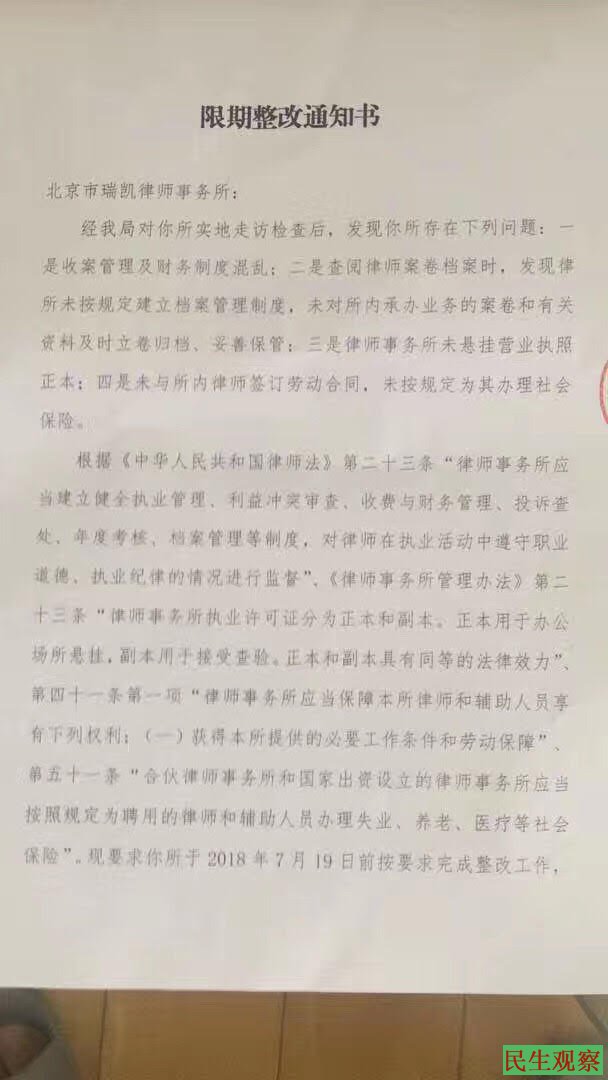 【民生观察2018年7月11日消息】今日(7月11日)是中国民主党人秦永敏“颠覆国家政权罪”案宣判的日子,秦案辩护人之一的北京蔺其磊律师因故未能前去武汉中院出庭而于今日收到其所属北京瑞凯律师事务所勒令《限期整改的通知书》。